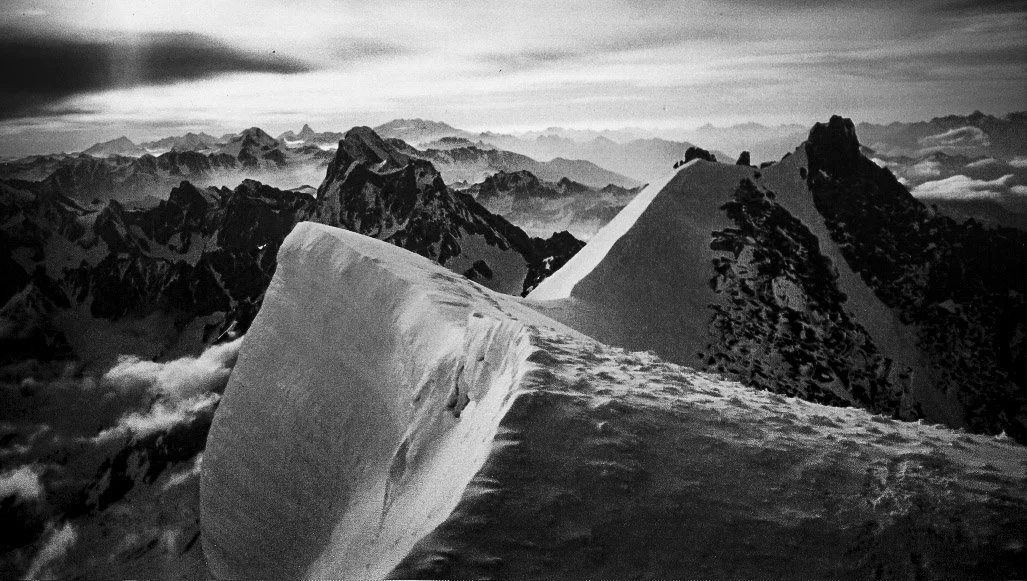 The photograph above was taken by a throw away film camera, above 12,000 on the summit of Mont Blanc Tacul. The mountain was treacherous and two weeks earlier had claimed seven or so people due to avalanche. It was unpredictable and violent. The final slopes required ice climbing with 1,000 foot snow cliffs dropping into France below us. We made the summit and I turned to take a number of shots, including this one. It was a brilliant experience and I became hooked on alpine climbing. Needless to say, the mountain reminded us of how violent it could be and we came across a fresh avalanche, huge blocks of ice the size of a house, while descending back onto the glacier.