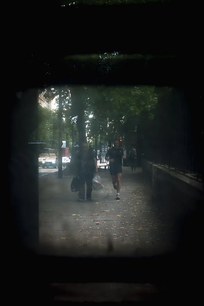 The above photograph is also an experimental shot. This was taken through two old British telephone boxes, so four panes of glass in total. The telephone boxes were locked so it was impossible to get inside them, so I decided to try and shoot through them - waiting for the right subjects to come into view.